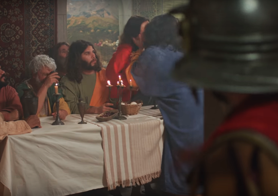 Na cena, Judas Iscariotes, interpretado pelo ator Gregório Duvivier, vai até a entrada do Cenáculo para tramar a prisão de Jesus com um soldado romano. Para que o oficial possa identificá-lo, ele sugere dar um beijo em Cristo.